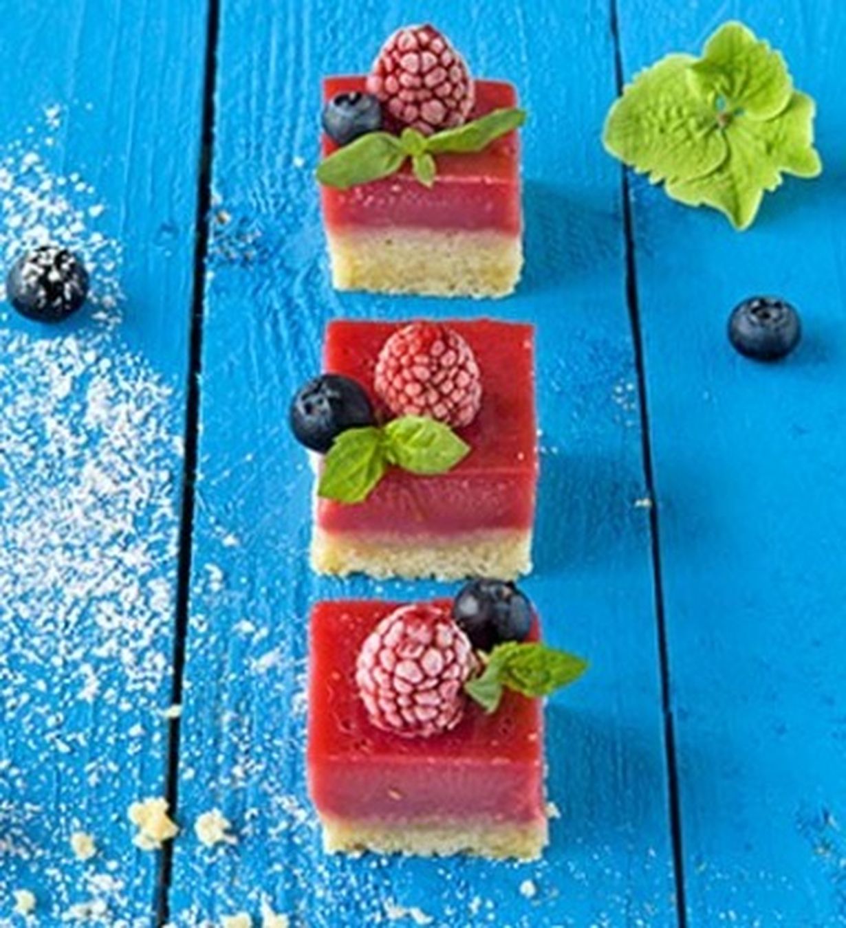 - Nosta hieman lämmennyt leivonnainen vuoasta paperin avulla ja leikkaa noin 3 x 3 sentin kokoisiksi ruuduiksi. Koristele vadelmilla, mustikoilla ja sitruunamelissalla tai mintulla. Myös kermavaahto sopii leivonnaisten seuralaiseksi. Tarjoa jääkaappikylminä, jopa hieman kohmeisina.