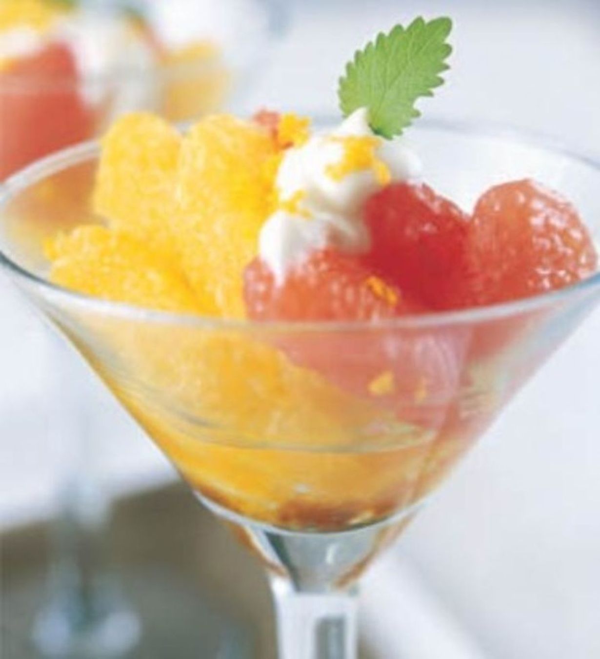 - Levitä hedelmälihat matalalle lautaselle tai lasimaljaan ja laita kermajogurttia päälle. Koristele esimerkiksi sitruunamelissalla.