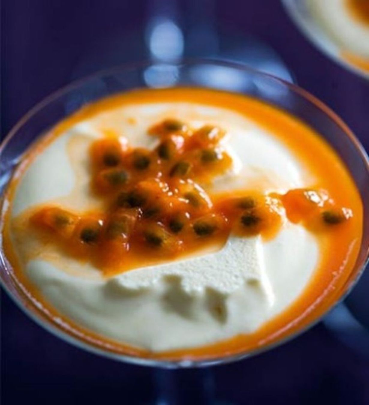 - Halkaise passionhedelmät ja irrota hedelmäliha. Sekoita ja purista mehu talteen. Sekoita kondensoitu maito ja hedelmämehu hyvin sekaisin. Sekoita kermavaahdon kanssa varovasti yhteen.