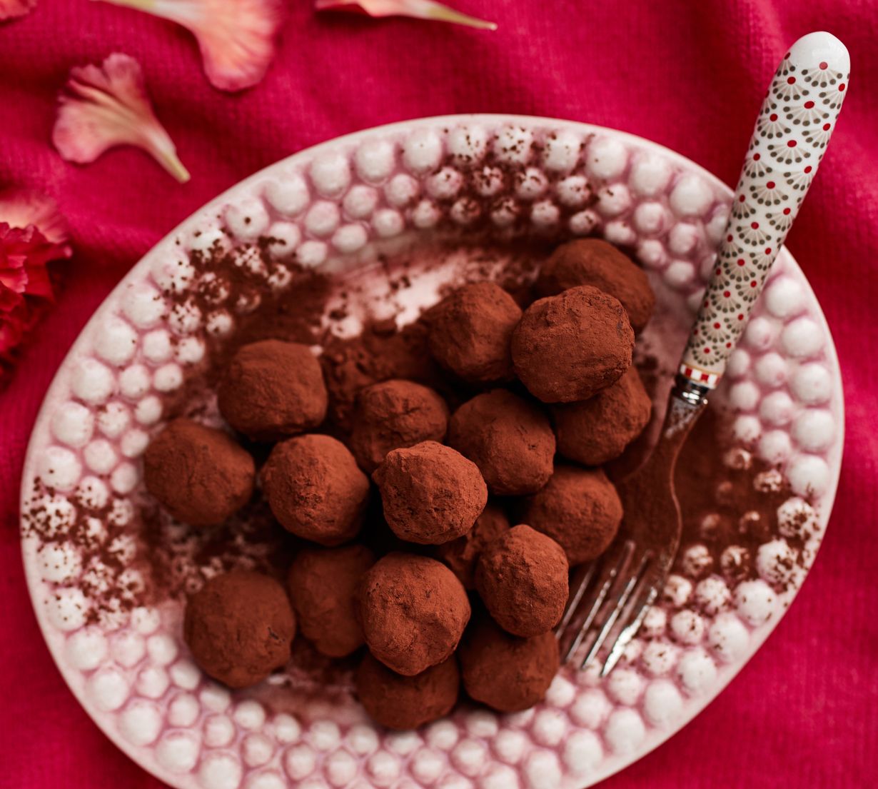 - Pyörittele seoksesta pieniä palloja ja kieritä ne kaakaojauheessa.