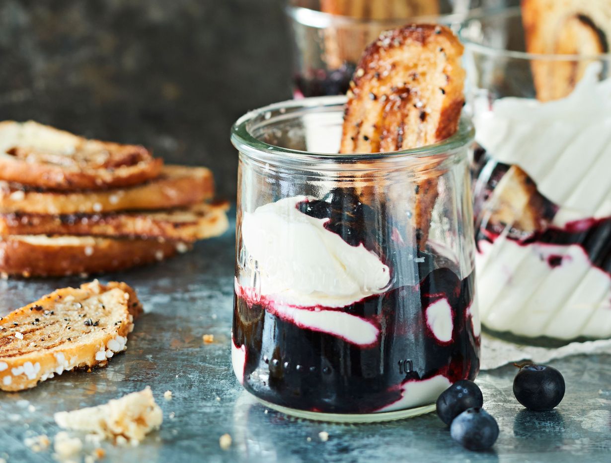 - Nostele laseihin kerroksittain kerma-jugurttivaahtoa, mustikkahilloketta ja korvapuustilastuja. Viimeistele tuoreilla mustikoilla.
