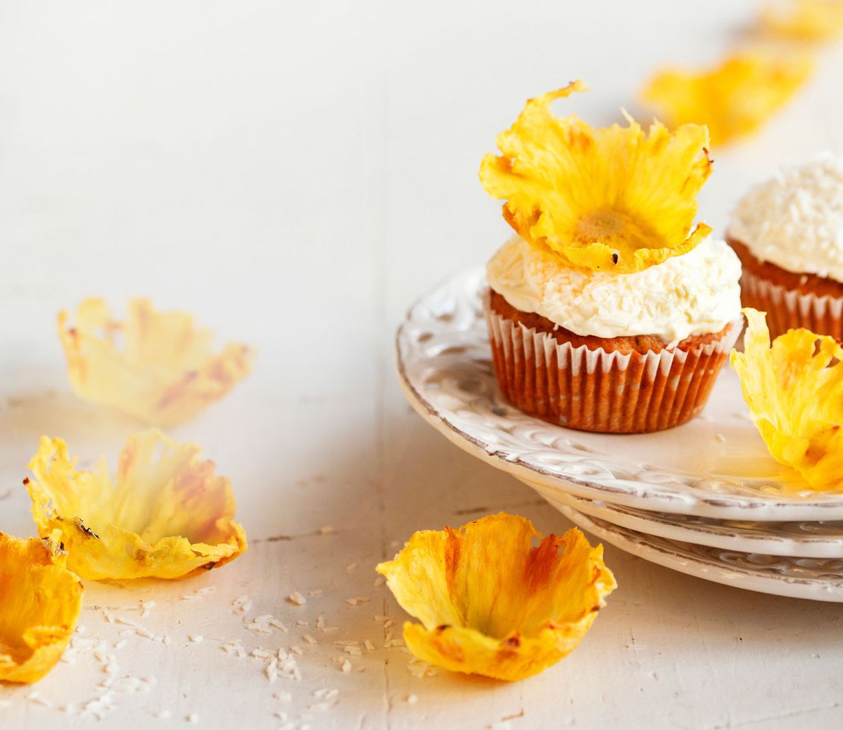 Juhlavat ananaskukat koristavat inkiväärille ja kookokselle maistuvat kuppikakut.