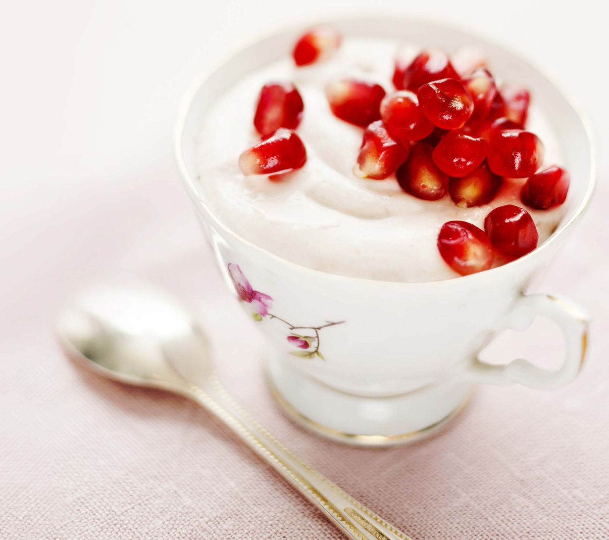 - Pursota moussea annosmaljoihin. Koristele granaattiomenan siemenillä.