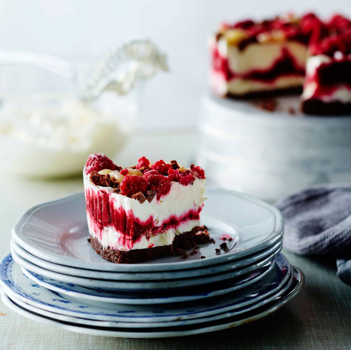 - Kokoa kakku pohjan päälle vuokaan. Levitä vuokaan ensin puolet kerma-tuorejuustoseoksesta. Tiputtele päälle sitruunatahnaa ja keittämäsi vadelmahilloke. Kaada loppu kerma-tuorejuustoseos varovasti päälle ja tasoita pinta. Murustele päälle muutama suklaakeksi. Tiputtele pintaan myös sitruunatahnaa ja kokonaisia jäisiä pakastevadelmia.