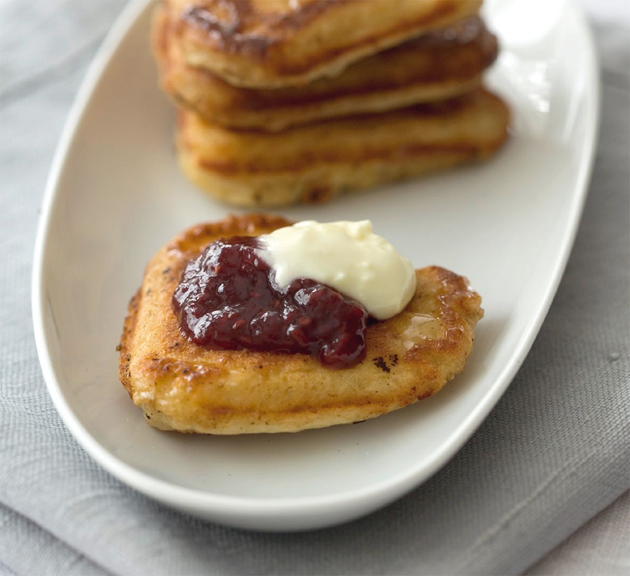 - Paista taikinasta blinipannulla paksuja blinejä tai pienellä räiskälepannulla pikkublinejä. Vaahdota kerma hyvin löysäksi sokerin kanssa. Lisää rahka halutessasi. Tarjoa blinit vadelmahillon, rahka-kerman ja teen kanssa.