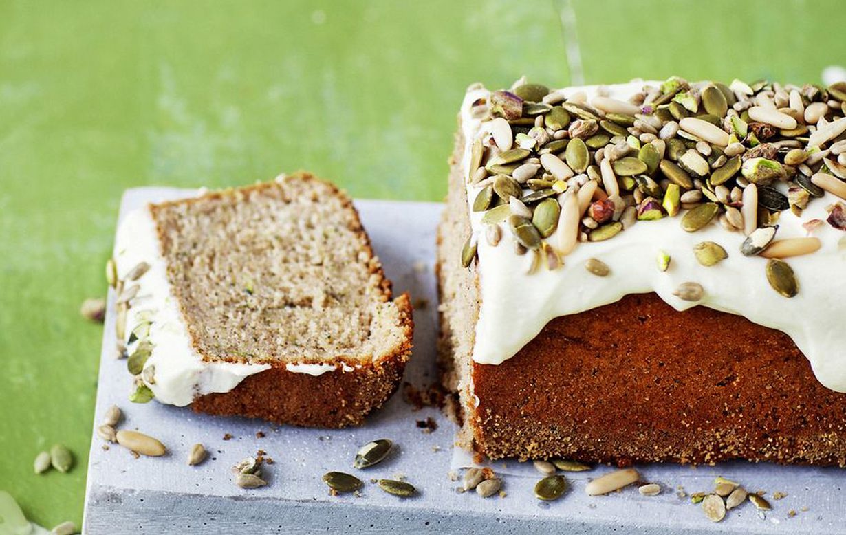 - Levitä täyte jäähtyneen kakun päälle. Koristele siemenillä ja rouhitulla pistaasilla.