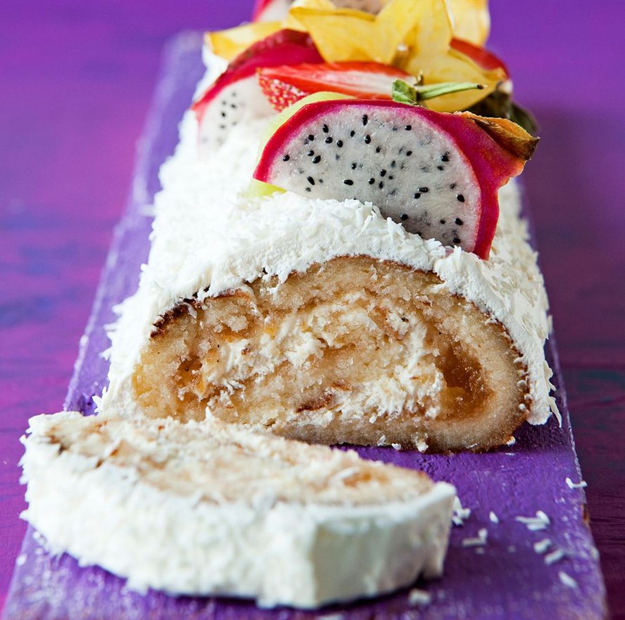- Vaahdota kerma ja mausta sokerilla ja sitruunamehulla. Levitä kääretortun päälle. Ripottele pinnalle kookoshiutaleita. Koristele kääretorttu haluamillasi eksoottisilla hedelmillä juuri ennen tarjoilua.