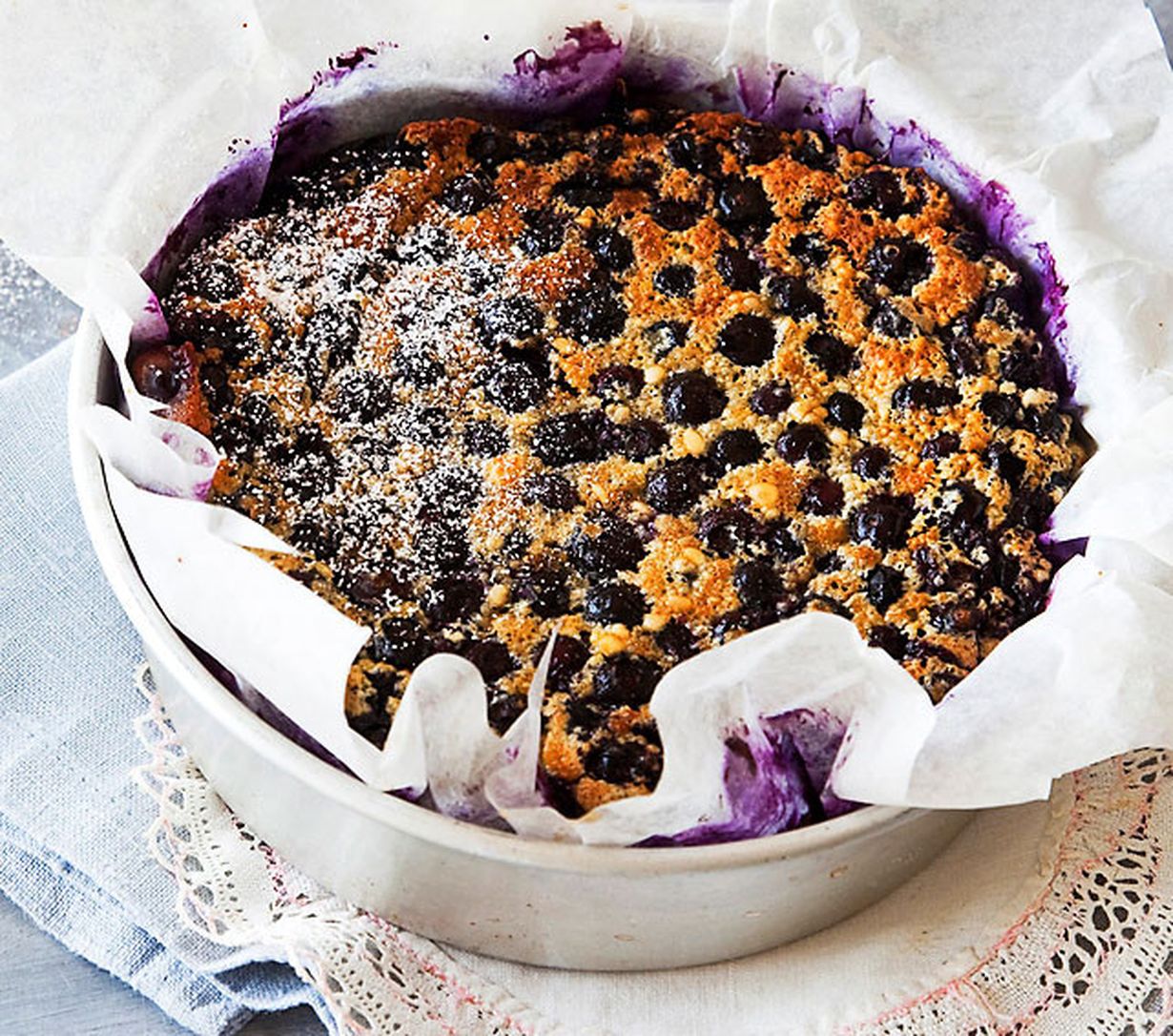 - Yhdistä kaikki taikinan aineet ja sekoita tasaiseksi. Kaada taikina mustikoiden päälle vuokaan.