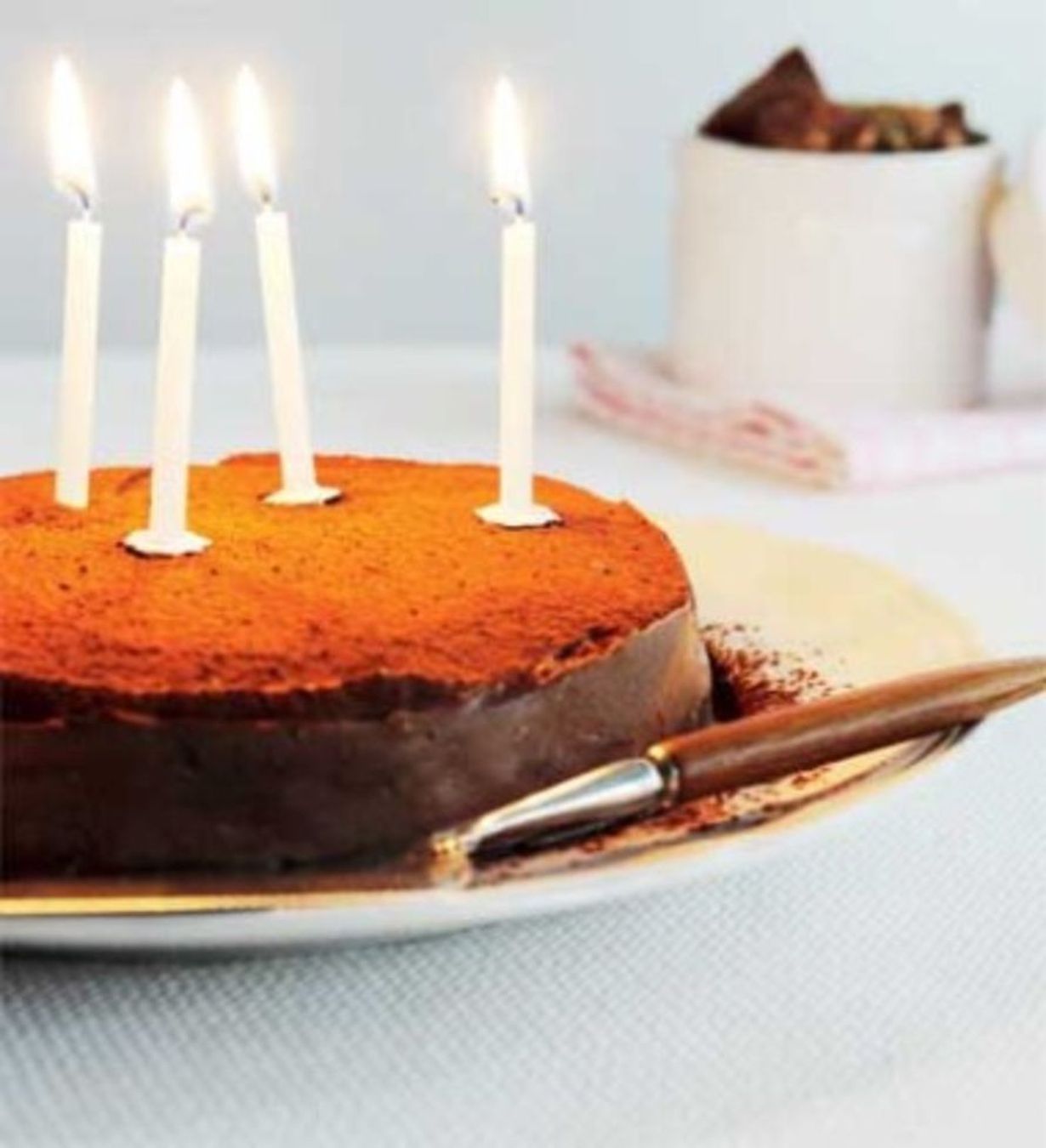 - Sekoita kuorruteaineet notkeaksi tahnaksi. Levitä kuorrute kakun päälle ja reunoille. Siivilöi teesihdillä kaakaojauhetta kakun päälle vähän ennen tarjoilua.