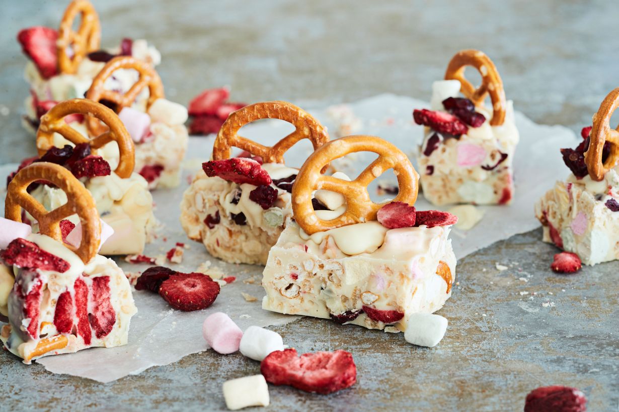 Voit tehdä rocky roadeista herkkukoreja kiinnittämällä pretzelit valkosuklaasulalla reunoille.