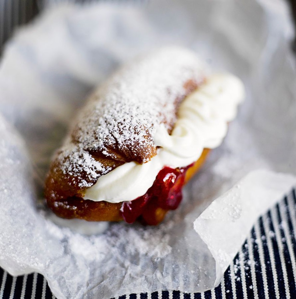 - Vaahdota kerma ja vaniljakerma erikseen. Sekoita yhteen. Leikkaa munkkien pitkät sivut auki. Täytä munkit hillolla ja kermavaahdolla. Sirottele munkkien päälle tomusokeria siivilän läpi.