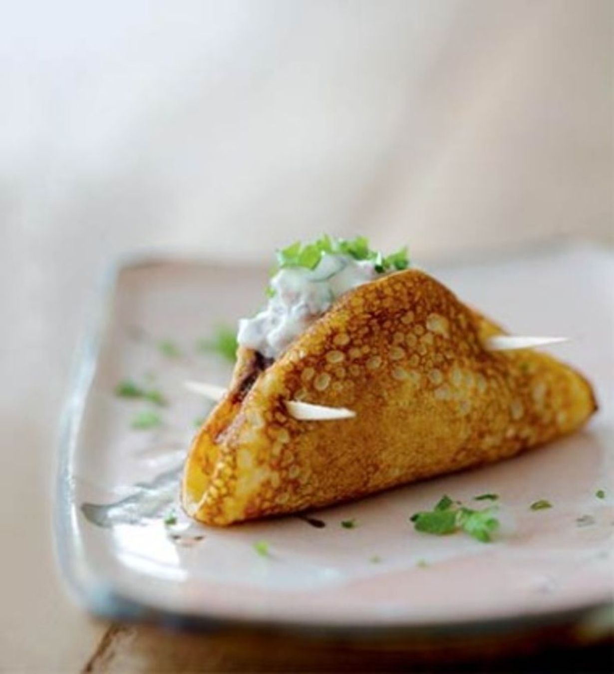 - Paista lettupannulla pieniä ohukaisia. Laita jokaisen letun keskelle ruokalusikallinen täytettä ja sulje letut hammastikuilla päistä, jolloin letut näyttävät Napoleonin hatuilta.