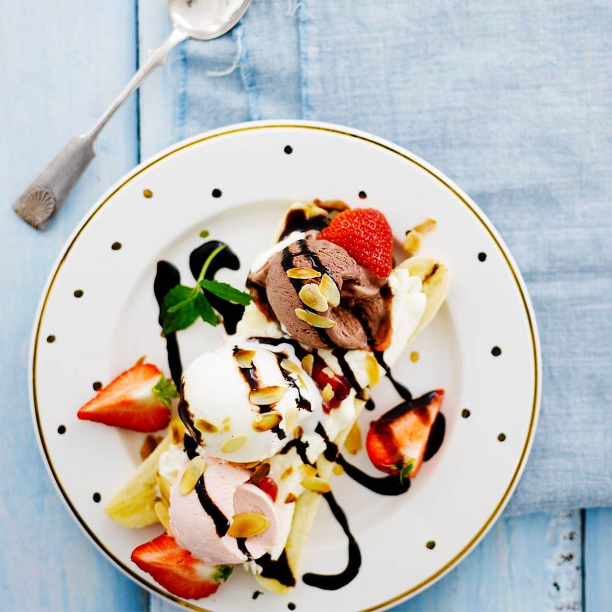 Asettele jäätelöpallot banaanien päälle ja pursota kermaa jäätelön päälle. Koristele annokset suklaakastikkeella, mansikoilla ja paahdetuilla mantelilastuilla.