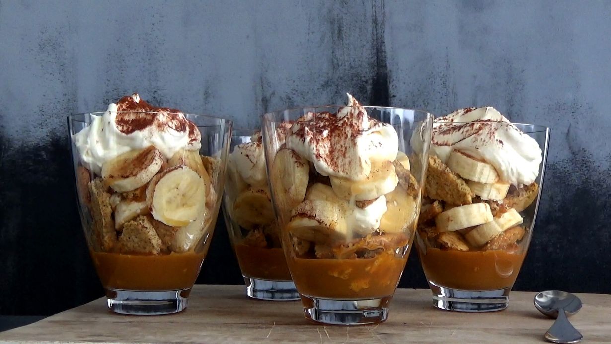 - Ota neljä juomalasia. Murustele lasien pohjalle keksejä, laita päälle banaaneita ja kinuskikastiketta. Tiputa laseihin seuraavaksi nokare kermavaahtoa. Tee vielä toiset kerrokset kekseistä, banaaneista, kinuskikastikkeesta ja kermavaahdosta.