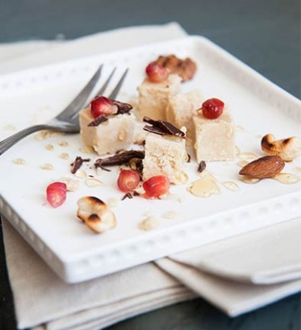 Valuta päälle hunajaa ja koristele jälkiruoka granaattiomenan siemenillä.