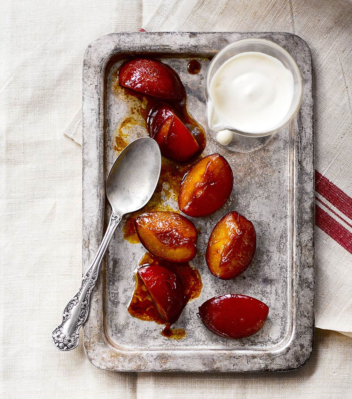 Huuhtele luumut, halkaise ne ja poista kivet. Kuumenna voi paistinpannulla. Lisää pannulle luumut, siirappi ja kaneli. Paista 3–5 minuuttia, kunnes luumut ovat pehmeitä. Tarjoa lämpimät luumut heti kylmän totikastikkeen kanssa.
