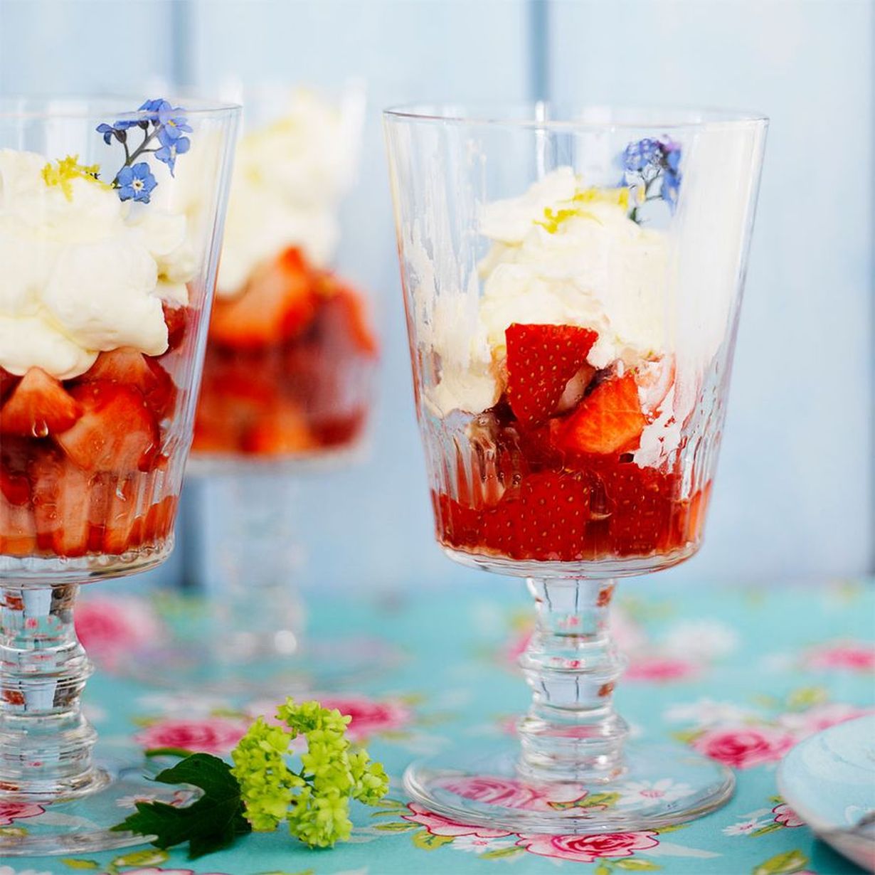 - Annostele lasien pohjalle mansikoita ja lientä. Lusikoi mascarponekermaa päälle. Koristele annos sitruunankuorella ja syötävillä kukilla.