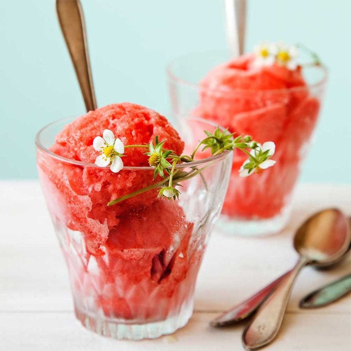 - Vatkaa seos puolijäisenä. Pakasta ja vatkaa taas. Anna olla pakkasessa vielä noin 2–3 tuntia niin, että sorbetti ei ole kivikovaa. Koverra sorbetti isolla lusikalla tarjolle laseihin ja koristele mansikoilla.