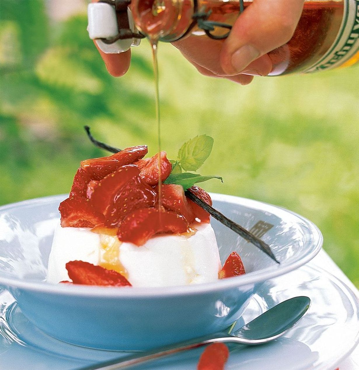 - Pilko reilusti mansikoita päälle ja kaada balsamicosiirappia kastikkeeksi. Koristele yrteillä.