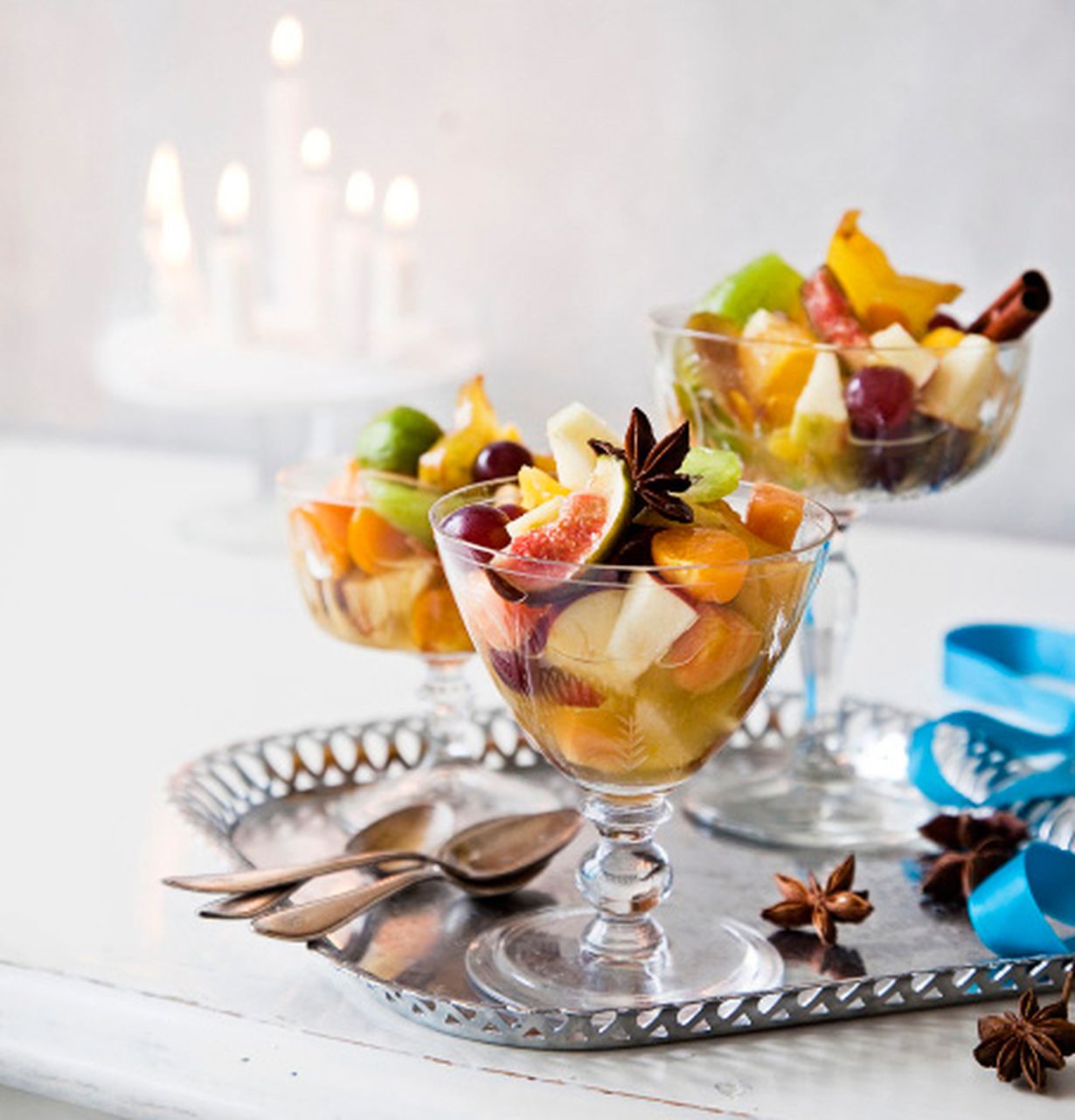 Raikkaassa hedelmäsalaatissa on talvisia mausteita.