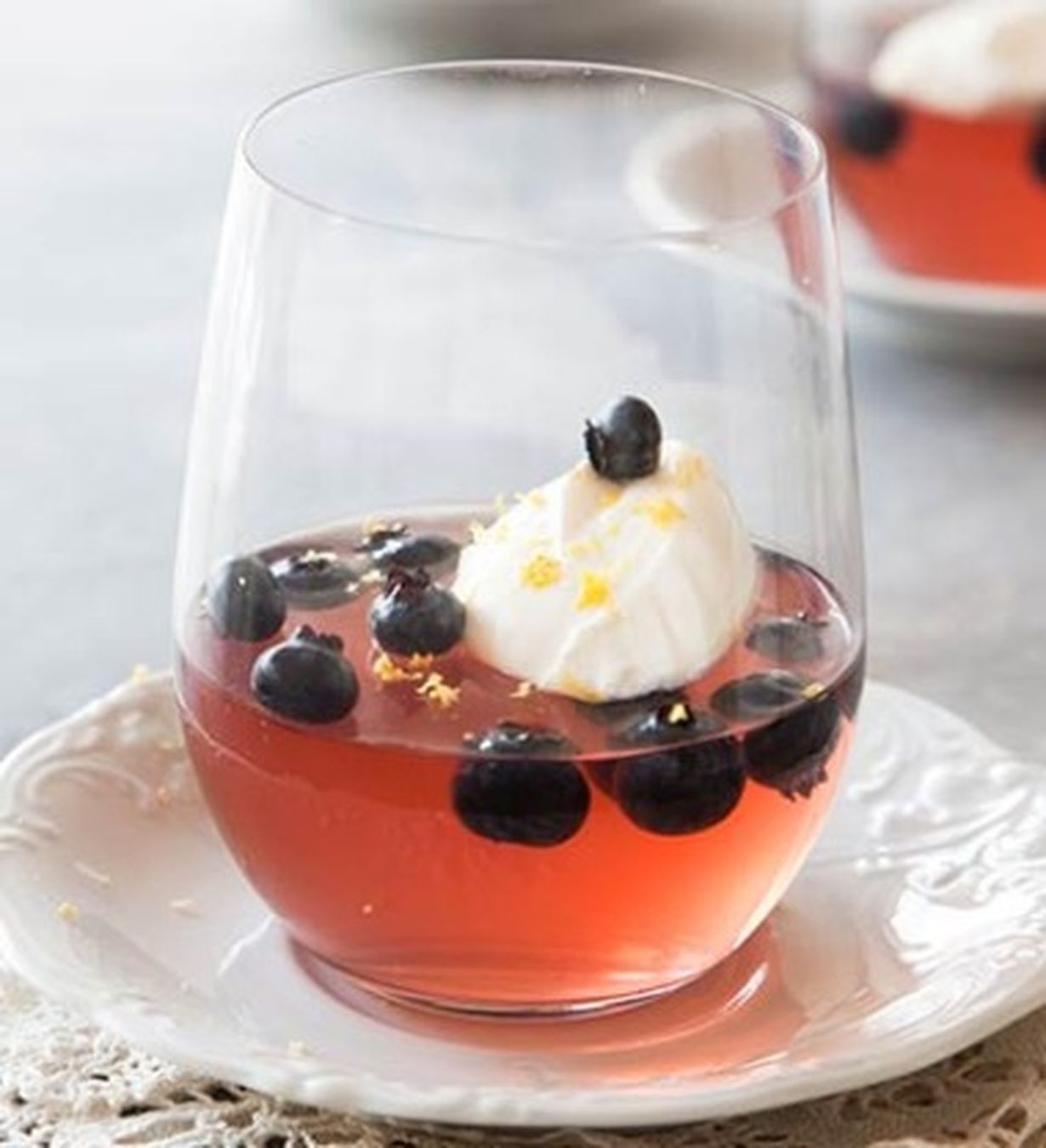 Mustikoita kuohuviinihyytelössä ja vaniljavaahtoa