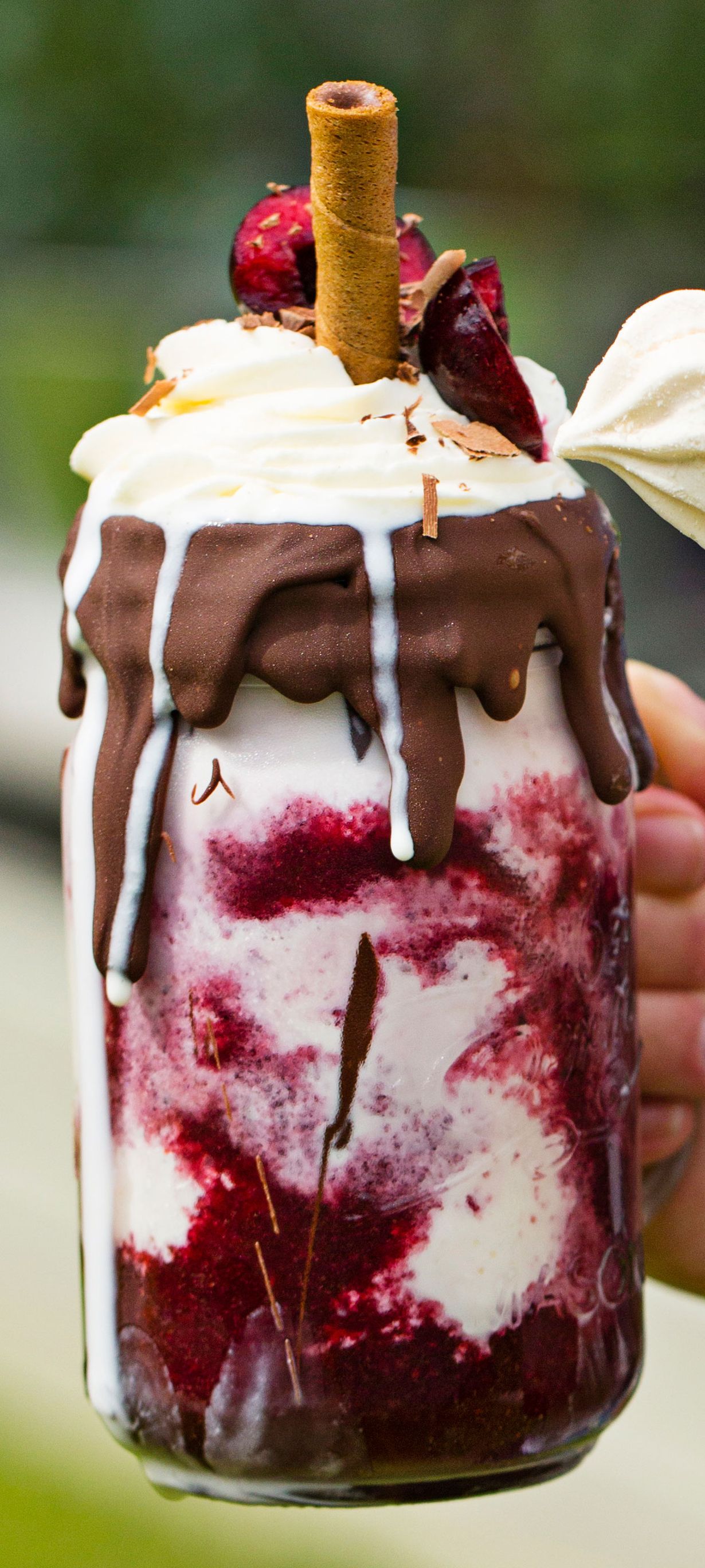 - Laita laseihin vuorotellen kirsikkasosetta ja pirtelöä. Pursota pinnalle reilut keot kermavaahtoa. Koristele kirsikoilla, vohveleilla ja suklaarouheella.