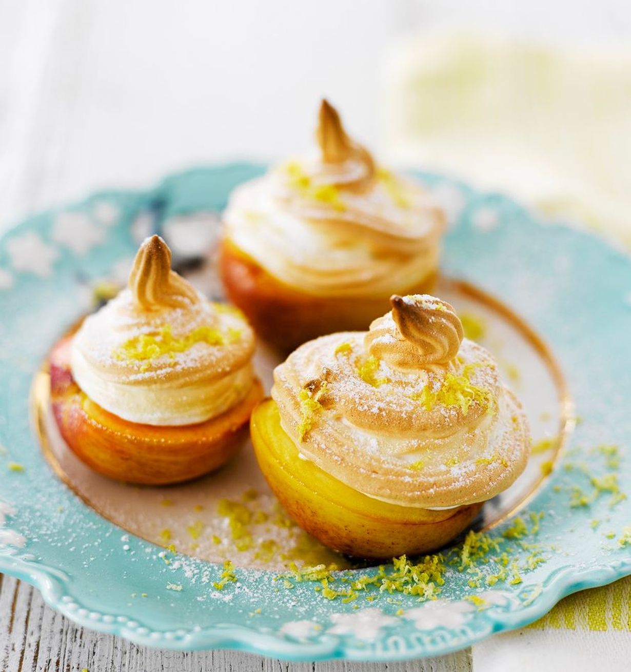 - Vaahdota tällä välin valkuaisia. Kun valkuaiset ovat pehmeää vaahtoa, lisää sokeri ja vaniljatangoista raaputettu sisus. Vatkaa kiinteäksi. Lusikoi marenkia jokaisen persikanpuolikkaan päälle.