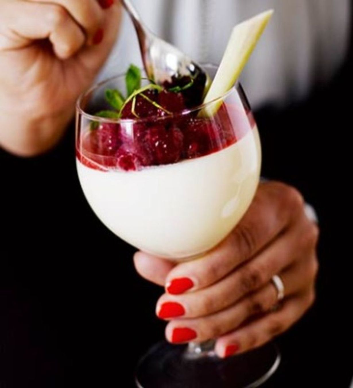 - Kaada seos neljään annoskulhoon (vetoisuus 1½–2 dl). Peitä kelmulla ja nosta jääkaappiin hyytymään vähintään pariksi tunniksi. Koristele marinoiduilla marjoilla.