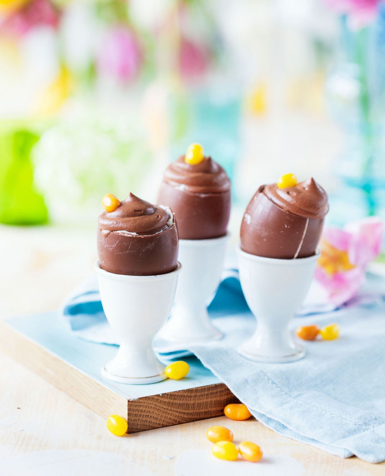 - Pursota suklaamuna täyteen moussea. Koristele pääsiäiskarkeilla.