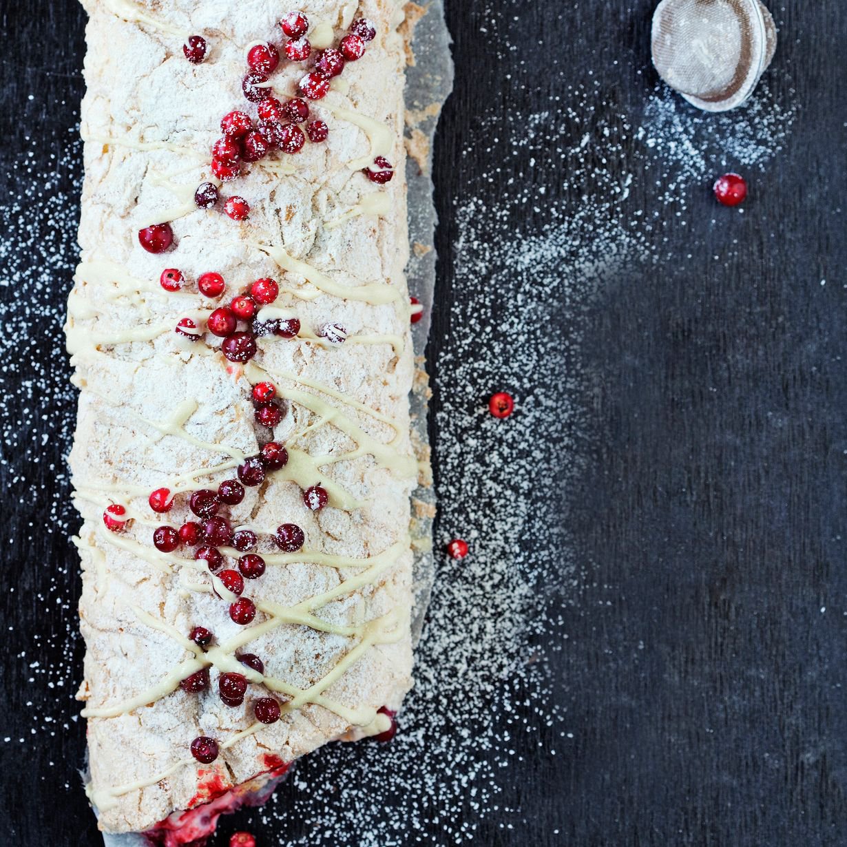 - Levitä täyte pohjalle ja rullaa kääretortuksi. Anna vetäytyä vajaa tunti jääkaapissa. Koristele torttu tomusokerilla, puolukoilla ja sulatetulla suklaalla.