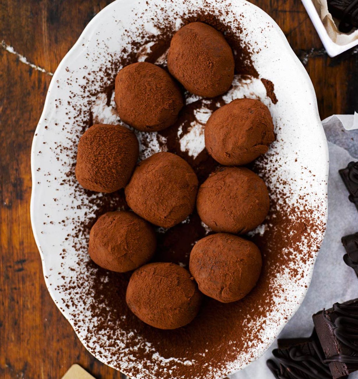 - Leikkaa tryffelitangot paloiksi tai ota vuoasta lusikalla paloja ja pyörittele ne palloiksi. Kierittele lopuksi kaakaojauheessa tai raastetussa suklaassa.