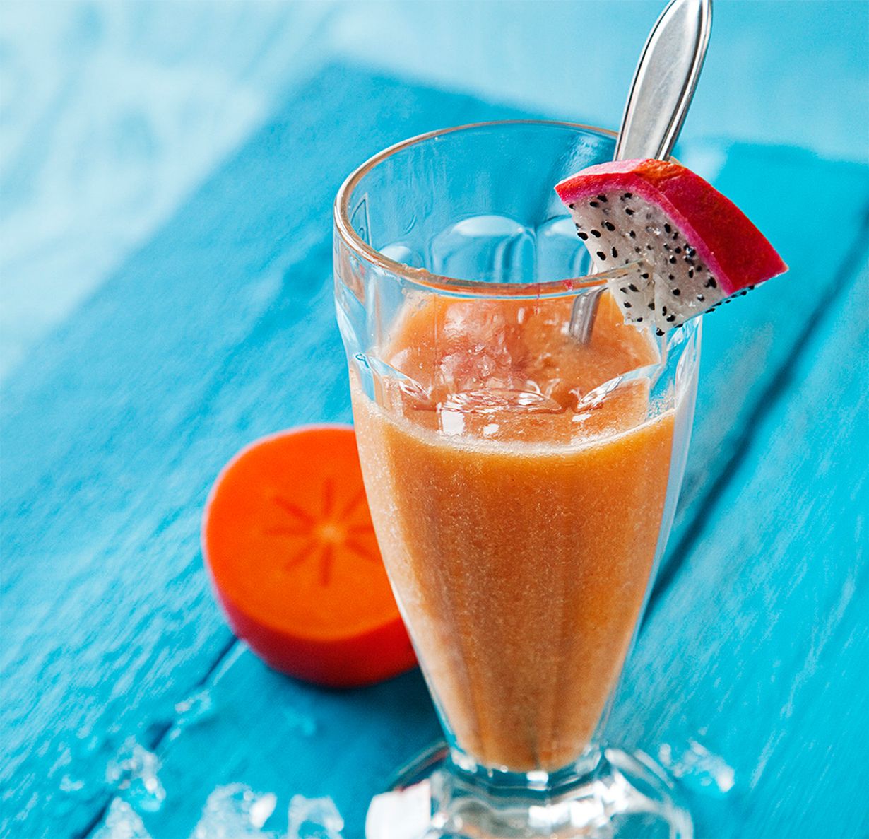 Kauniin värinen persimon maistuu hunajalla makeutetussa smoothiessa.