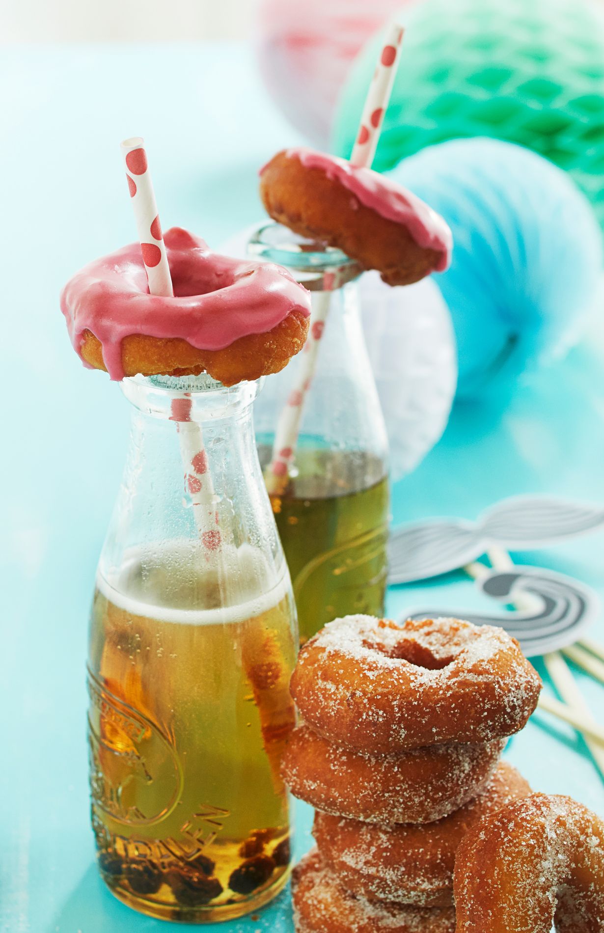 Pestyistä mehu- tai smoothiepulloista saa kivan lisän juhlakattaukseen. Etikettiliima irtoaa pesuainevedessä liottamalla ja teräsvillalla hankaamalla.