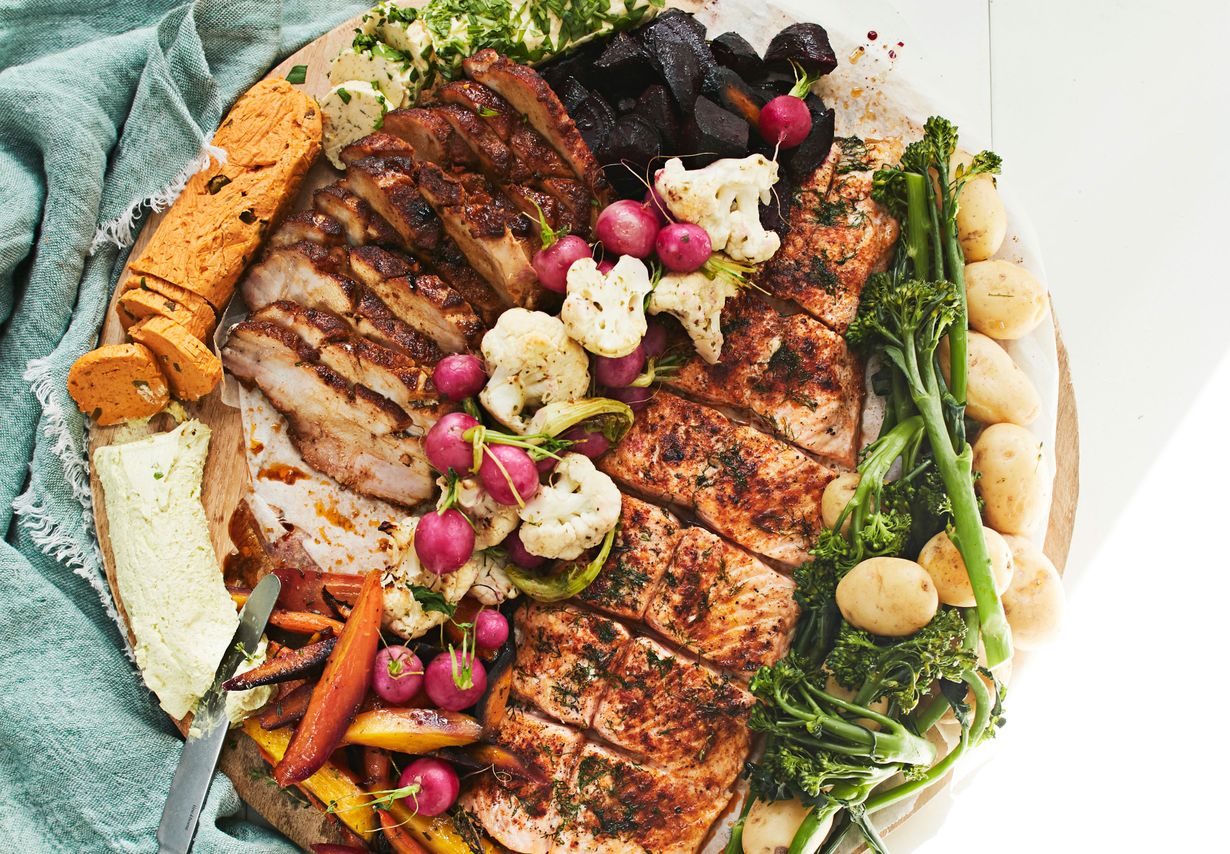 Jos joukossa ei ole allergisia, tarjoa paahdettu possu, kasvikset ja lohi samalta laudalta.