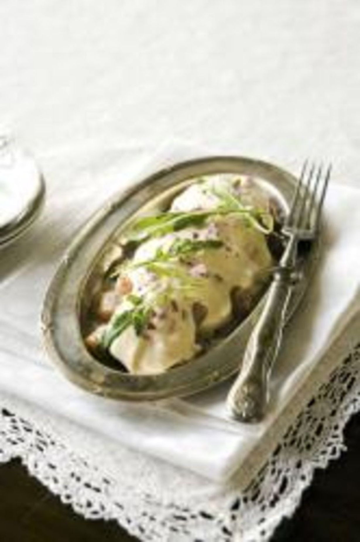 - Viipaloi silli ja laita tarjoilulautaselle. Lusikoi päälle smetanaseos. Koristele rucolalla ja roseepippurilla.