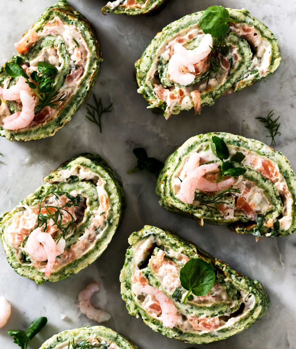 Vinkki! Vihertävä munakasrulla näyttää kauniilta sellaisenaankin, mutta rullan päälle voi myös levittää tuorejuustoa ja koristella sen kylmäsavulohisuikaleilla, kokonaisilla katkaravuilla ja yrteillä.