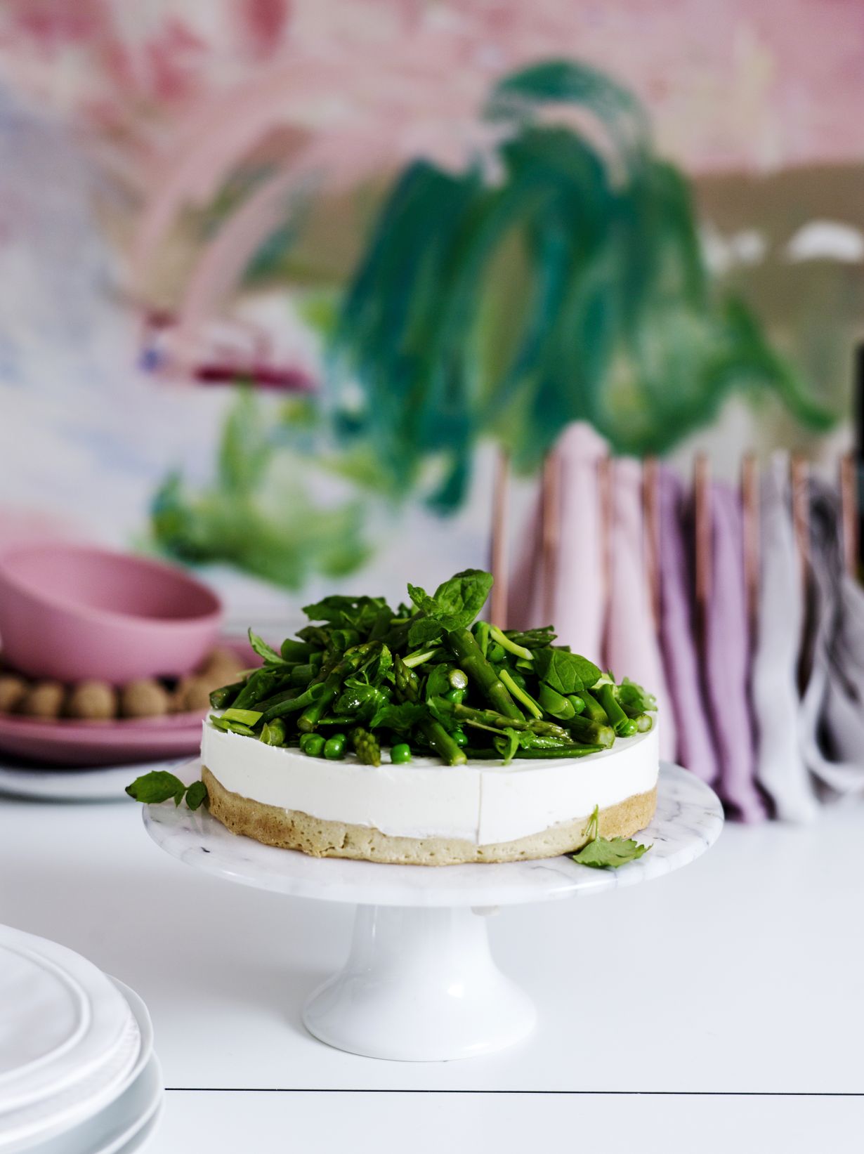 Parsajuustokakku on moderni versio voileipäkakusta. Pohja on rapeaa murotaikinaa, päällä on ricottajuustoa. Komeus on koristeltu marinoidulla parsalla ja sokeriherneillä.