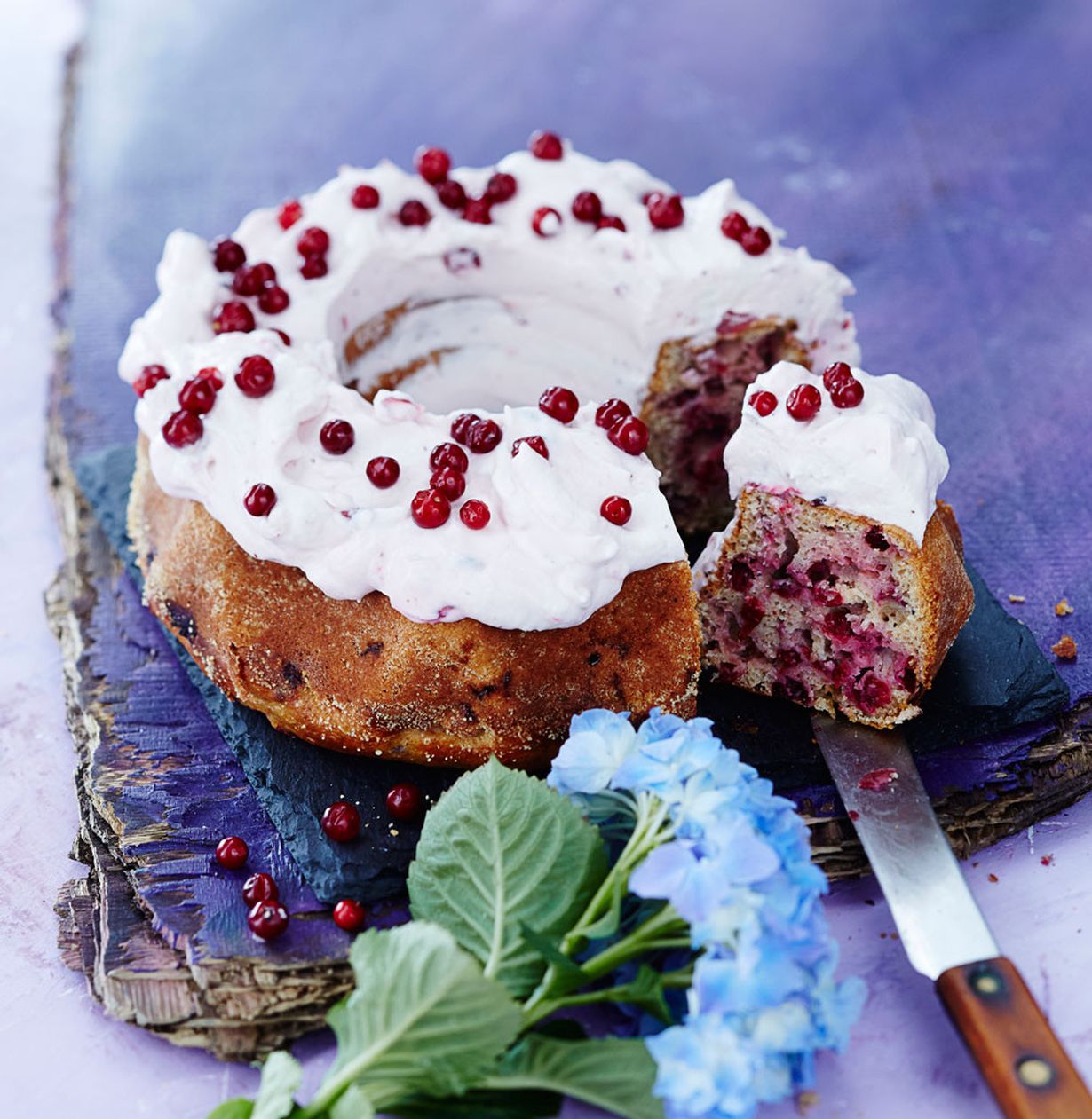 - Kuumenna uuni 175 asteeseen. Sekoita munat, sokeri ja kermaviili. Yhdistä kuivat aineet ja sekoita ne muna-sokeriseokseen. Pyöräytä mukaan puolukat.