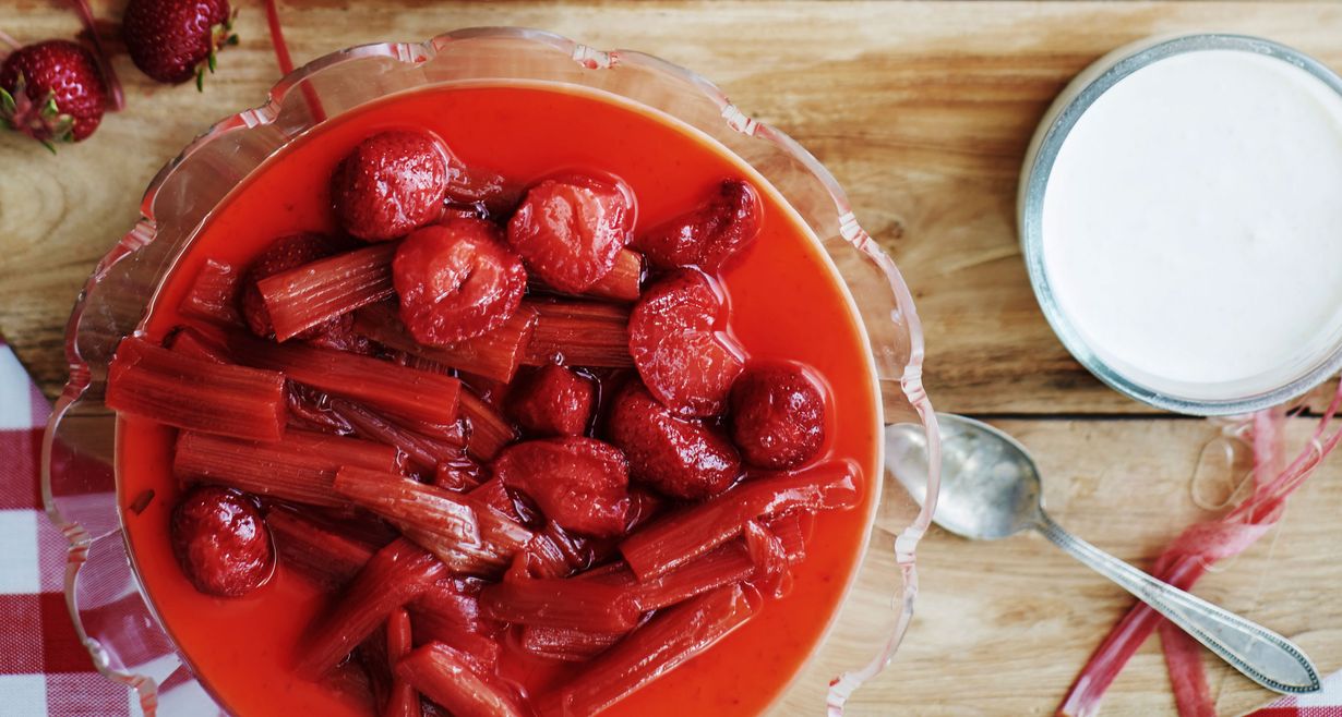 Raparperi ja mansikka ovat klassikkoyhdistelmä, nyt jugurtilla raikastetun pannacotan päällä.