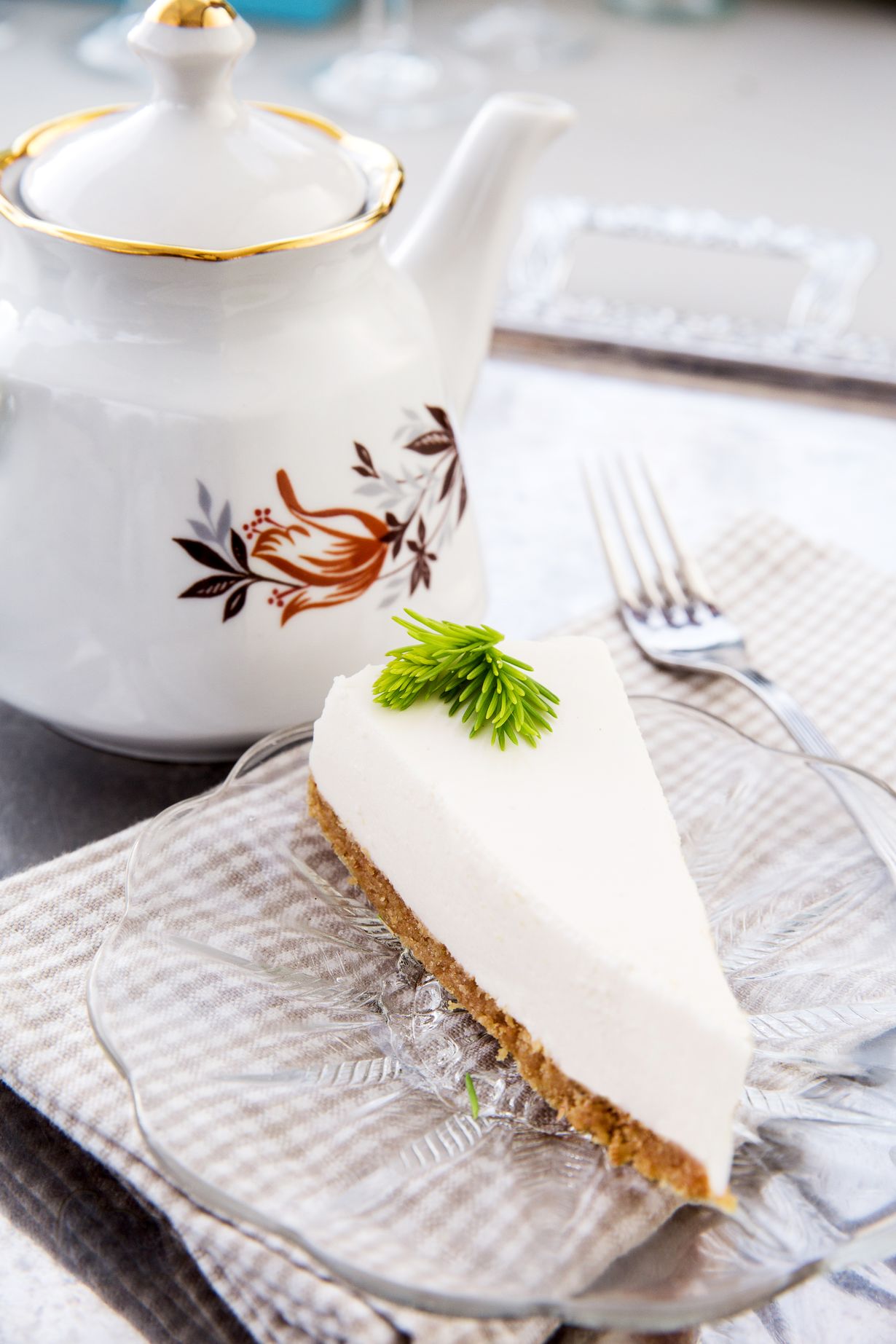 - Kaada täyte irtopohjavuokaan keksipohjan päälle. Anna kakun hyytyä vuoassa jääkaapissa muutama tunti tai seuraavaan päivään. Koristele kakku kuusenkerkillä.