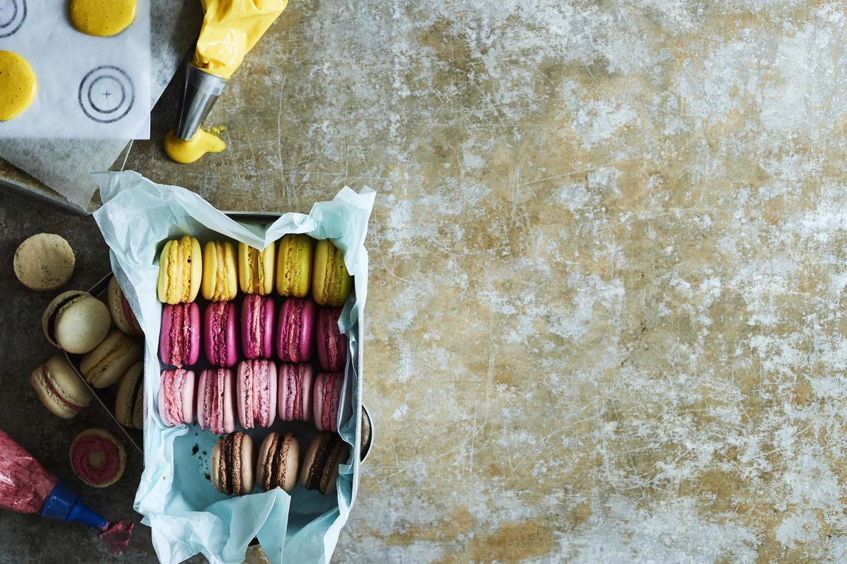 Saat samankokoisia leivoksia, kun piirrät leivinpaperin nurjalle puolelle lyijykynällä malliympyrät vaikkapa snapsilasin avulla. Leivontaliikkeistä saa myös tarkoitukseen suunniteltuja silikonialustoja. Anna pursotettujen pohjien kuivahtaa huoneenlämmössä ennen paistamista, niin ne eivät halkeile uunissa. Tarkkaile leivoksia paiston ajan, sillä macaronien ei kuulu ruskistua. Jos paistetut pohjat eivät irtoa leivinpaperista siististi, ne ovat raakoja. Paista siis vielä pari minuuttia.