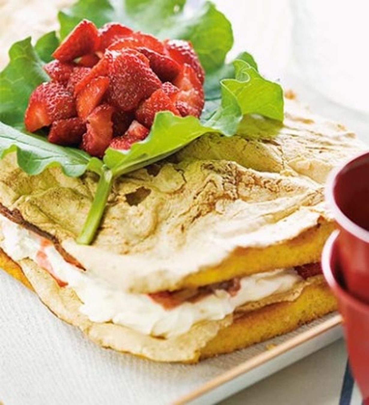 - Paista uunin alatasolla 175 asteessa 20-25 minuuttia. Jäähdytä. Vaahdota kerma sokerin kanssa.