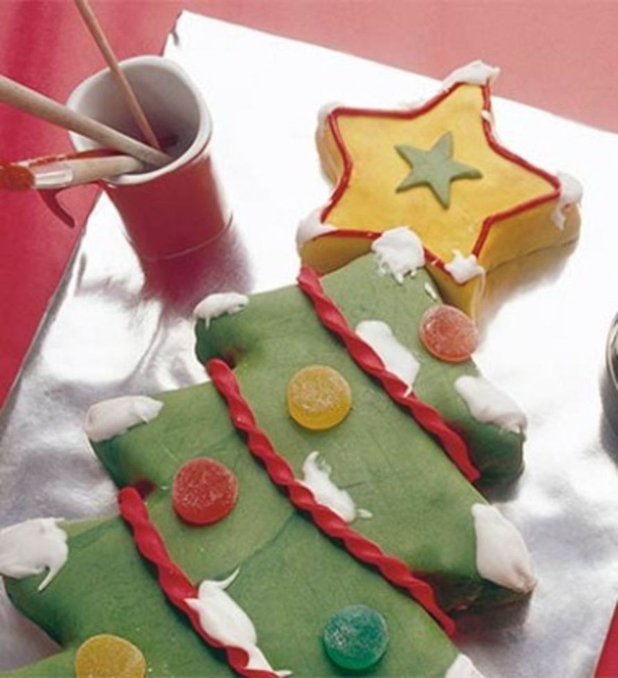 - Piirrä haluamasi kokoinen jalallinen kuusi ja tähti paperille. Leikkaa niistä muotit, jotka voit laittaa kakun päälle malliksi. Leikkaa muotin mukaan kakusta kuusi.