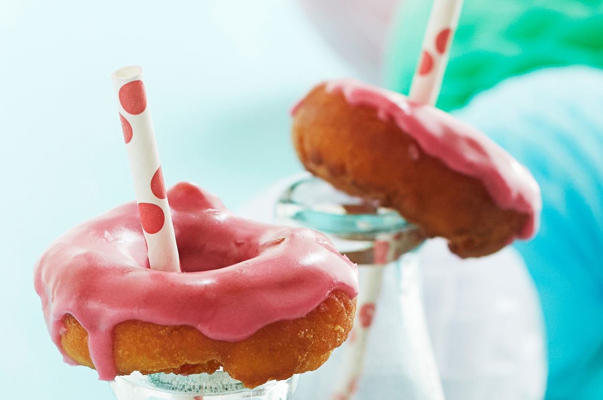 Mansikanmakuisesta tomusokerista syntyy herkullisen pinkki kuorrute donitseille.