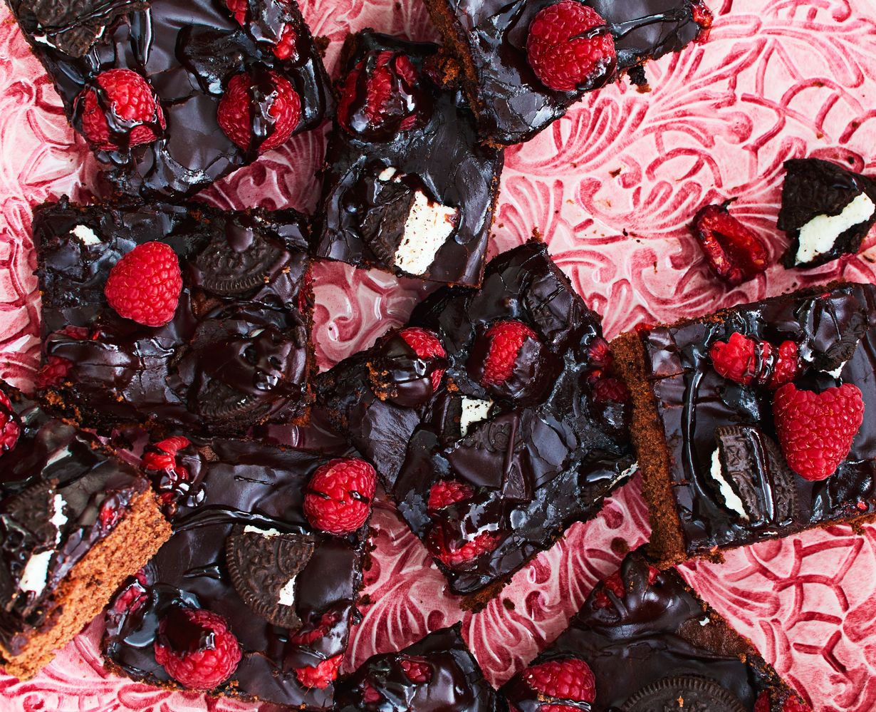 Oreo-kekseillä ja vadelmilla koristellut mokkapalat ovat niin täyteläisen makeita, että pellillisestä riittää monelle. Tällä ohjeella onnistuvat myös klassiset supermehevät mokkapalat, kun jätät keksimurut pois.