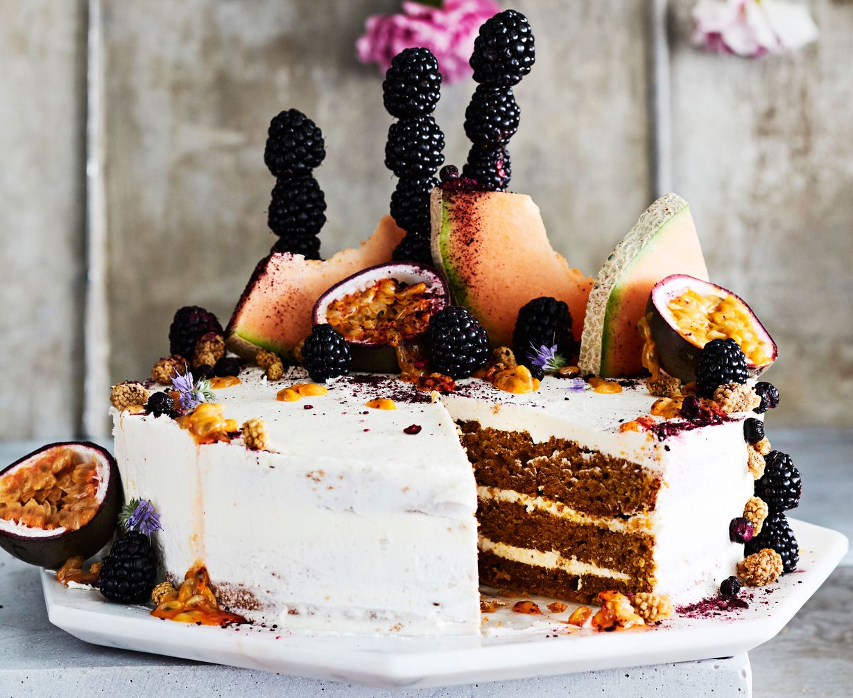 Koristele kakku hedelmillä, marjoilla ja kuivatulla mustikkamurulla. Saat boysenmarjoista tornin pujottamalla ne varrastikkuun.