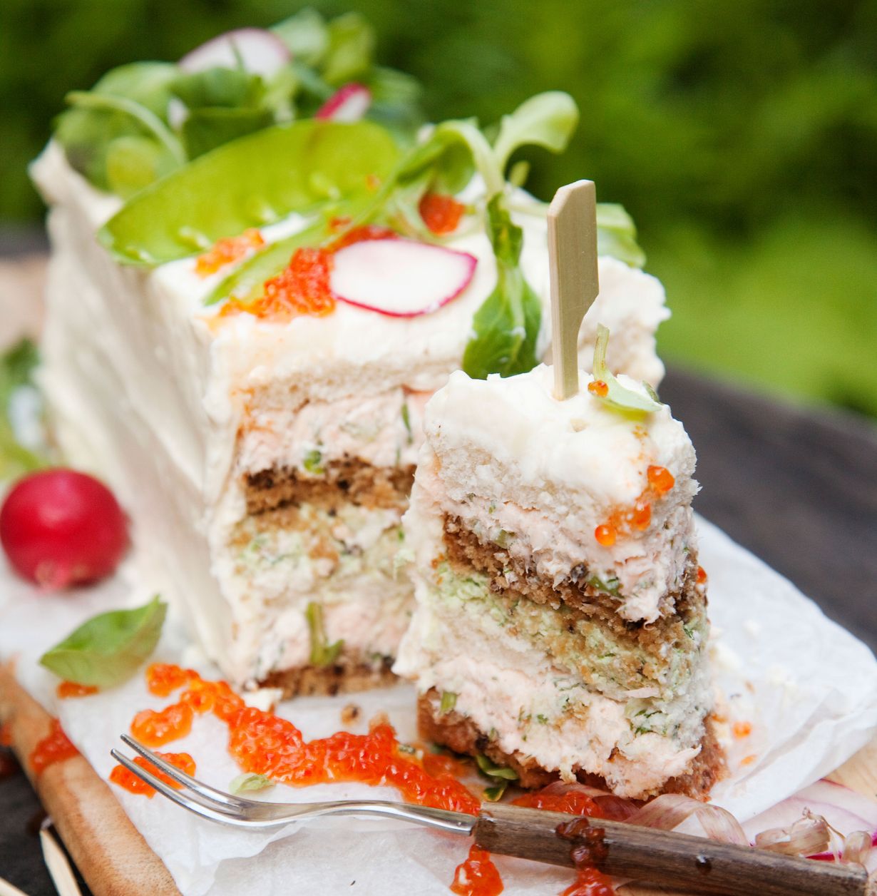 Joskus meinaa unohtua, että voileipäkakku syntyy yhtä helposti kuin vaikkapa suolainen piirakka. Tuorejuuston ja savulohen seuraan liittyy yllätysvieras raparperi. Kakun voi tarjota myös valmiina suupaloina.