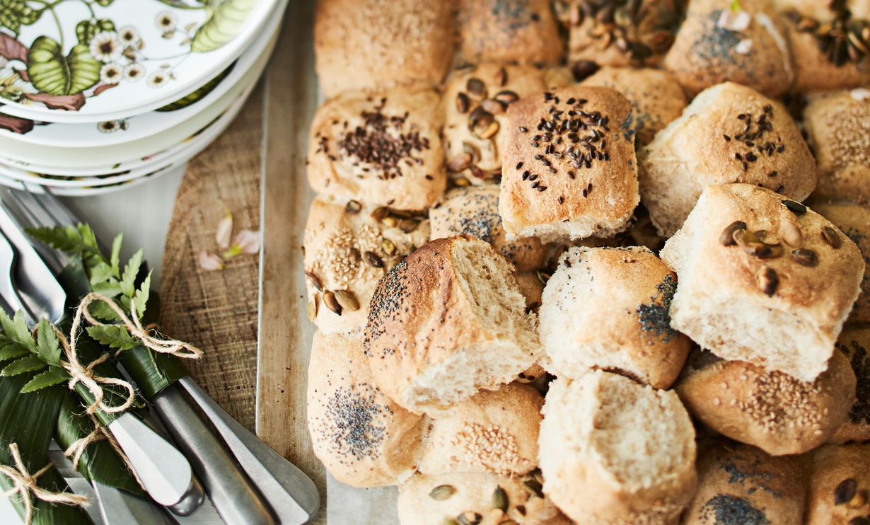 - Ripottele päälle siemeniä ja anna nousta liinan alla kaksinkertaisiksi. Paista pellillistä 15-20 minuuttia.
