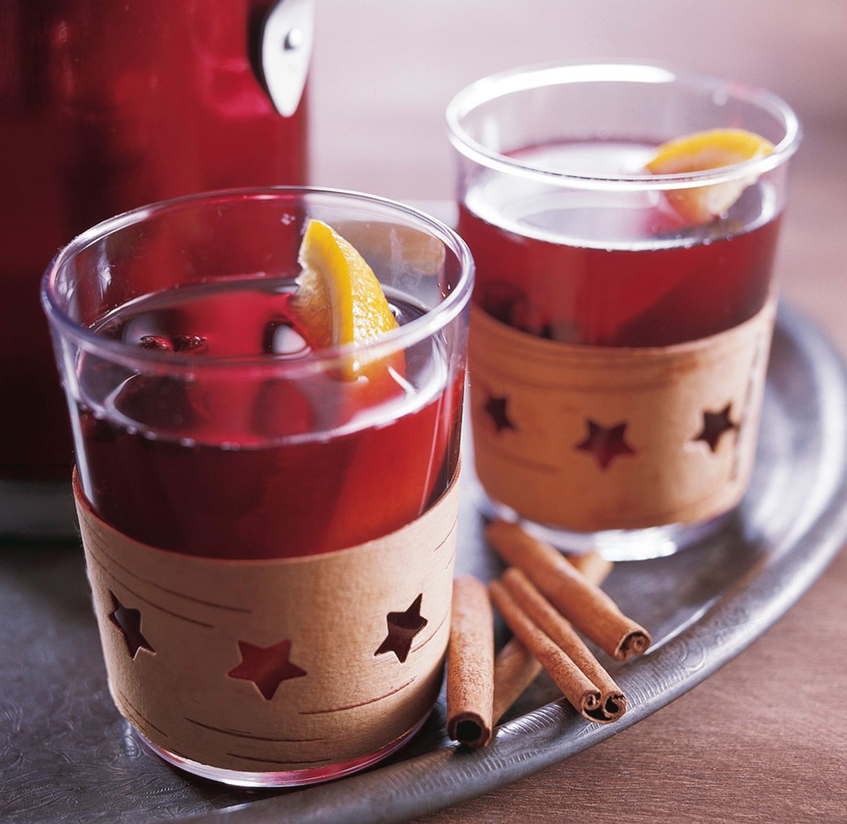 Kuumenna punaviini kattilassa. Älä keitä. Lisää appelsiinimehu, vesi ja sokeri.