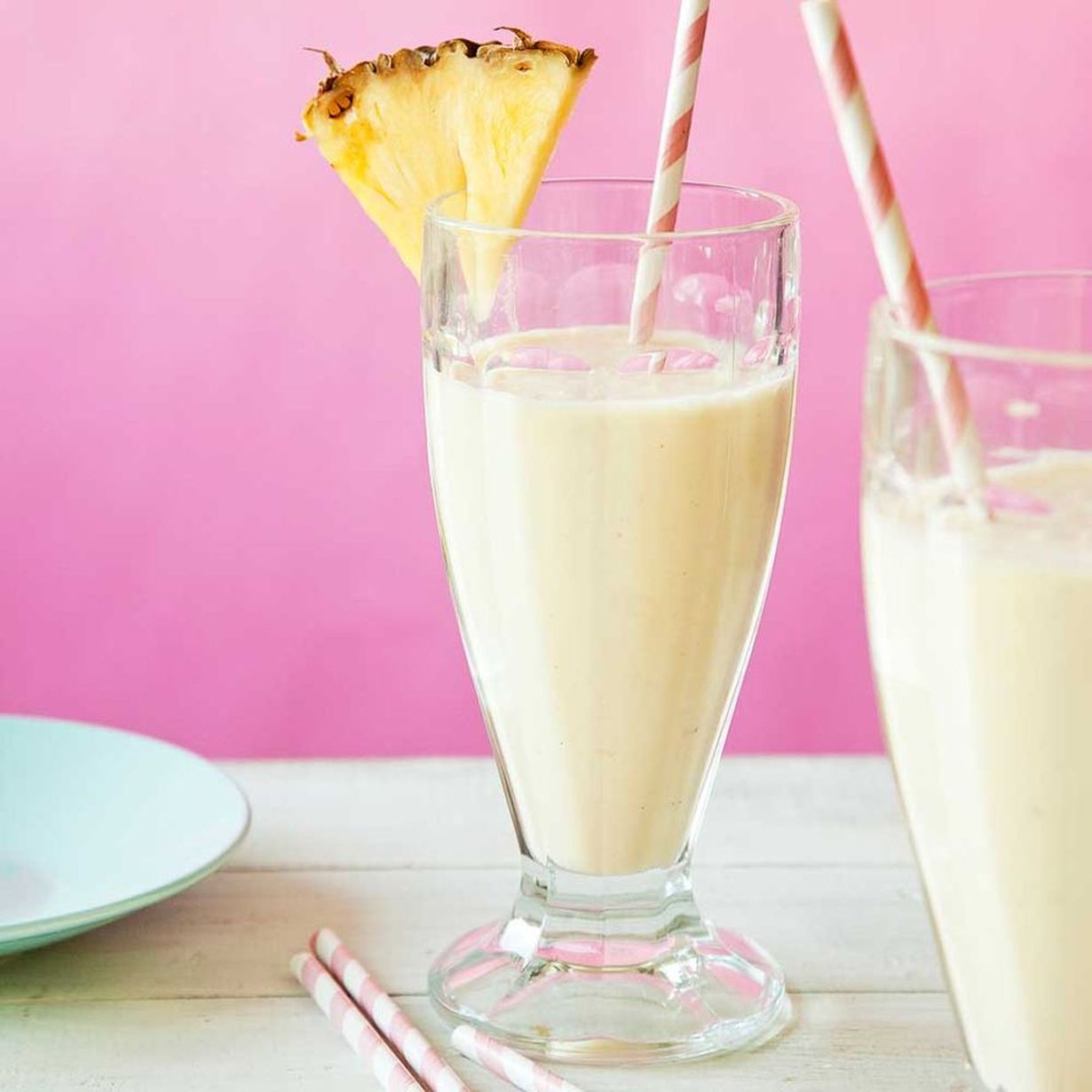 - Kuori ananas ja leikkaa kuutioiksi. Laita ananas, jäätelö ja kookoskerma tehosekoittimeen. Soseuta tasaiseksi pirtelöksi.